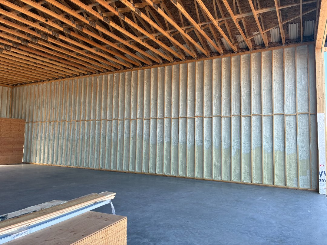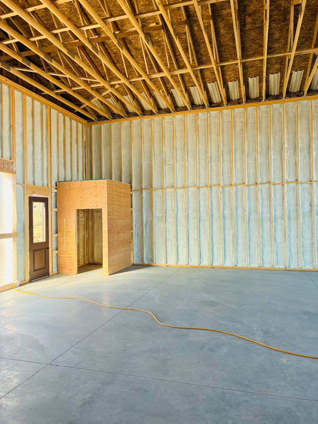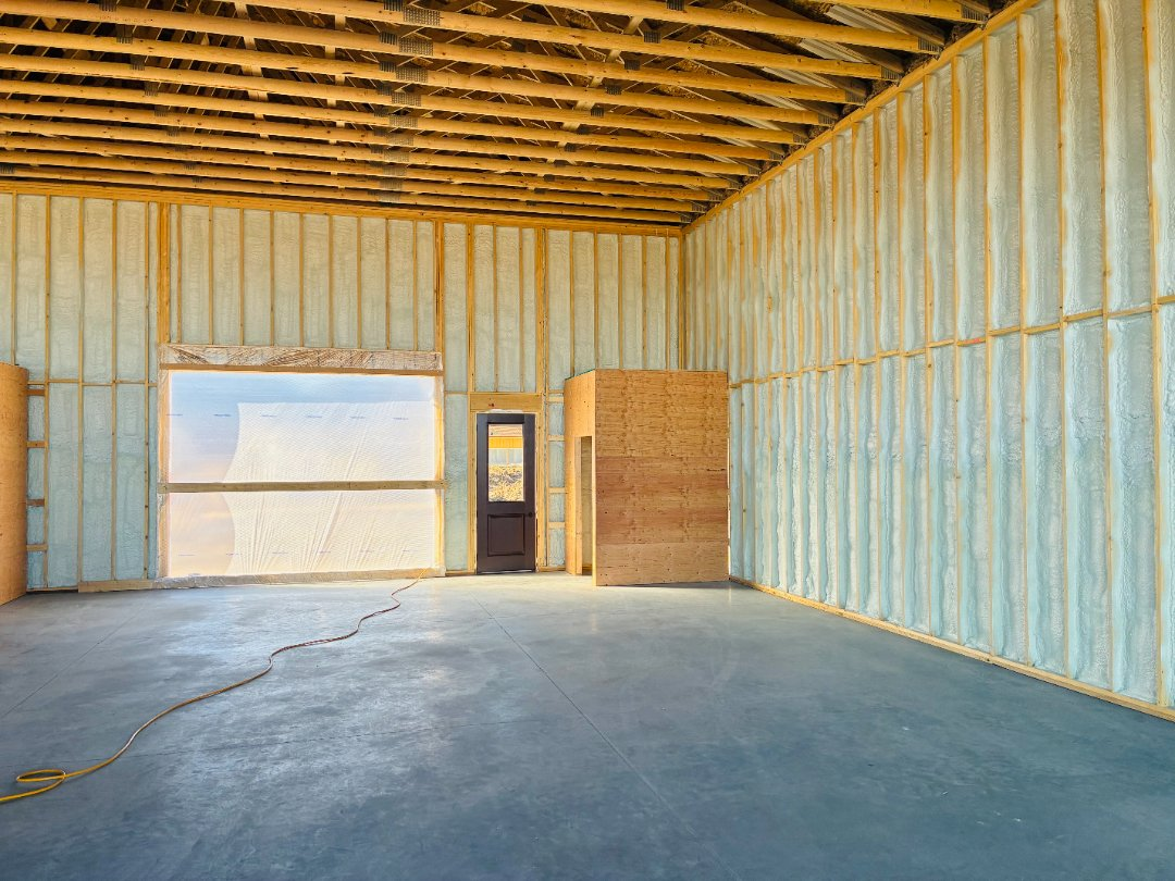 Because of the building’s large front opening—nearly 30 feet wide—the structure needed to remain solid and stable. Closed cell spray foam contributes to that strength, helping reduce movement and improving overall durability.